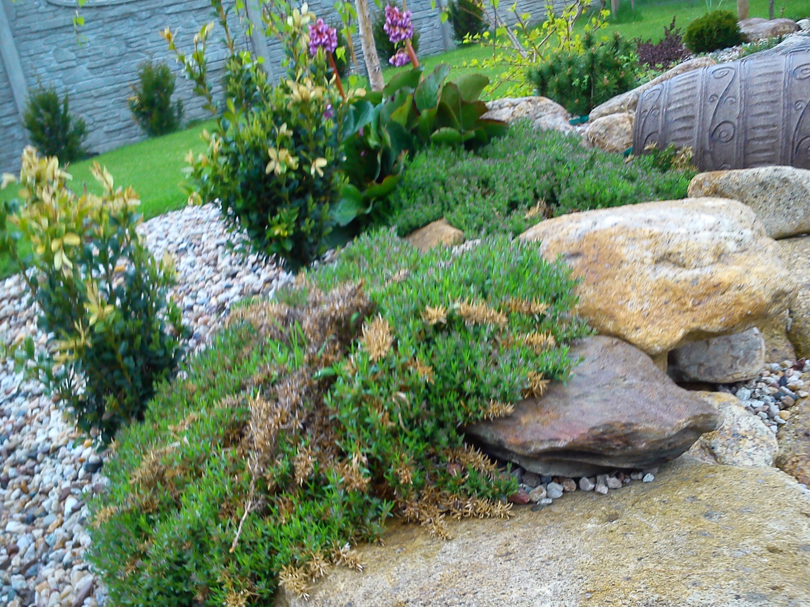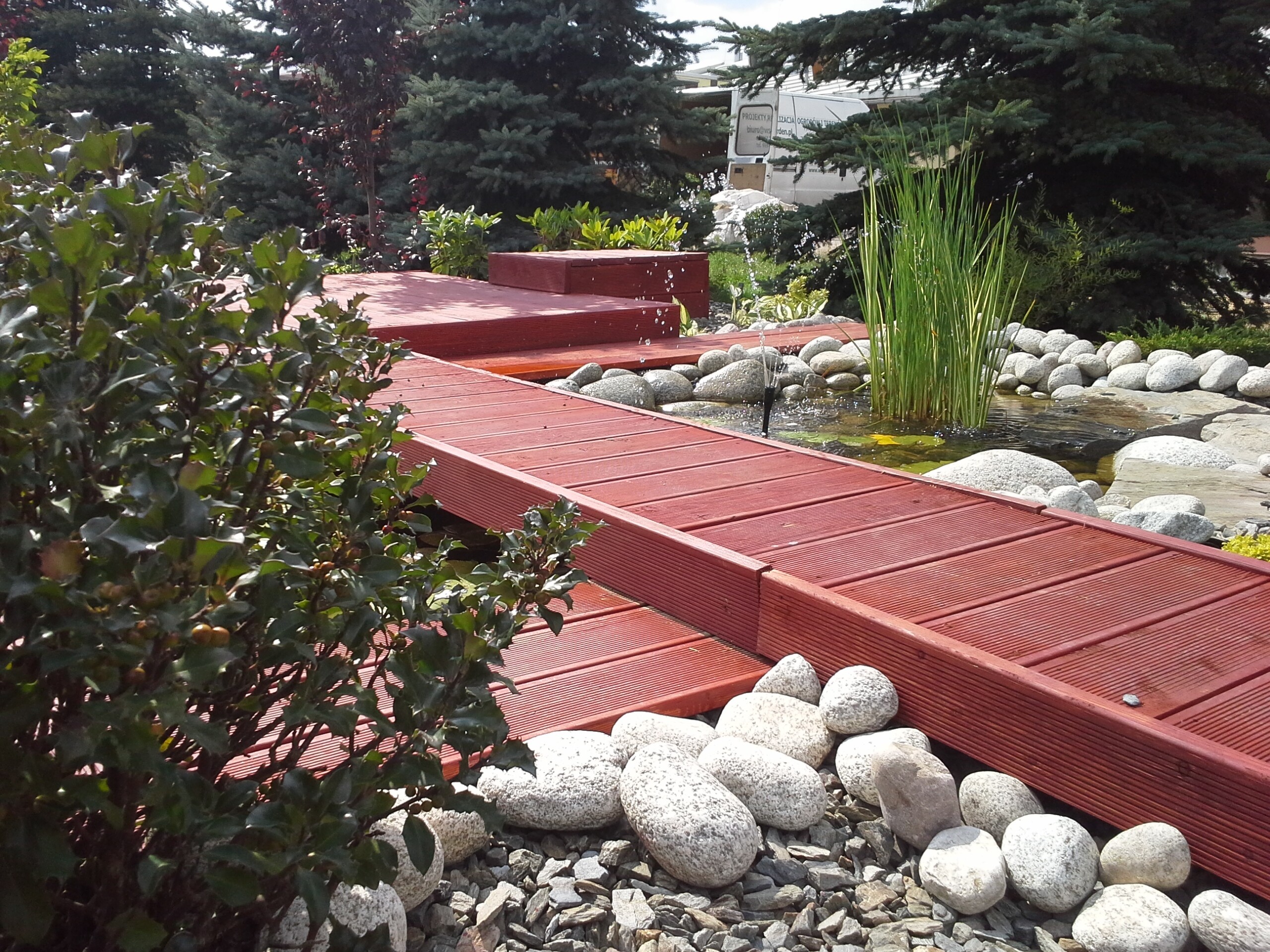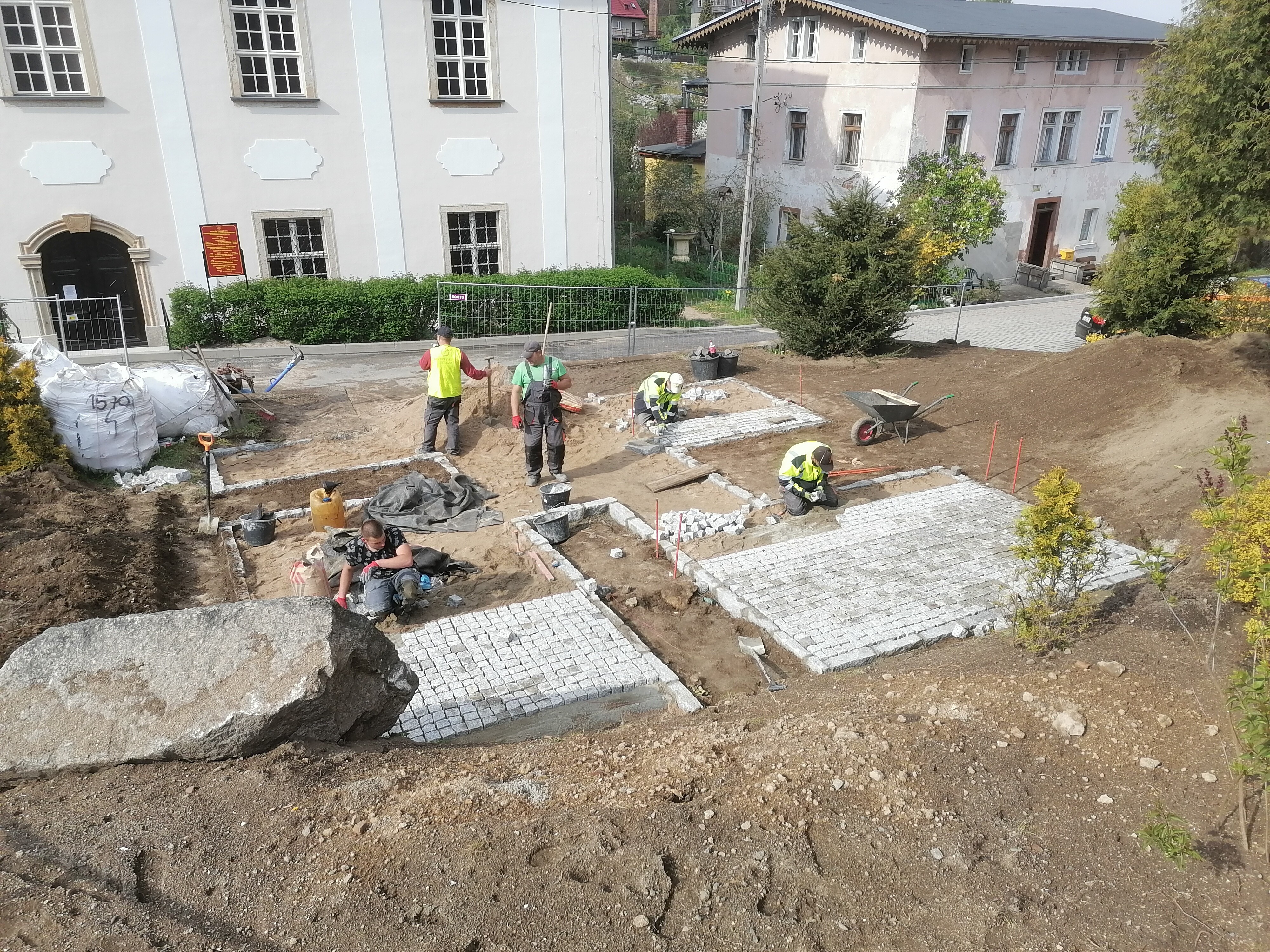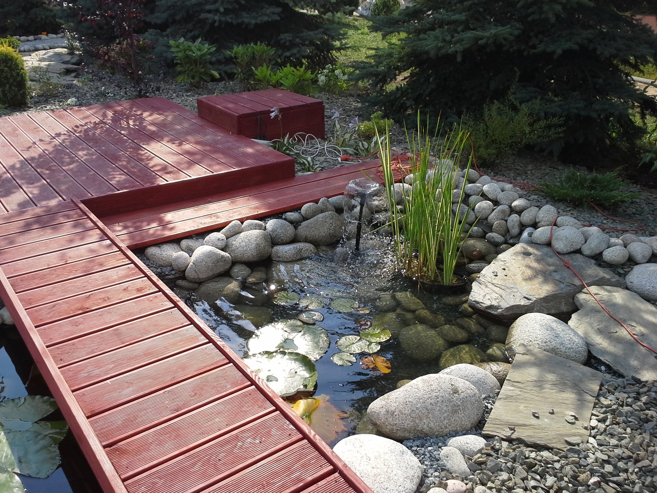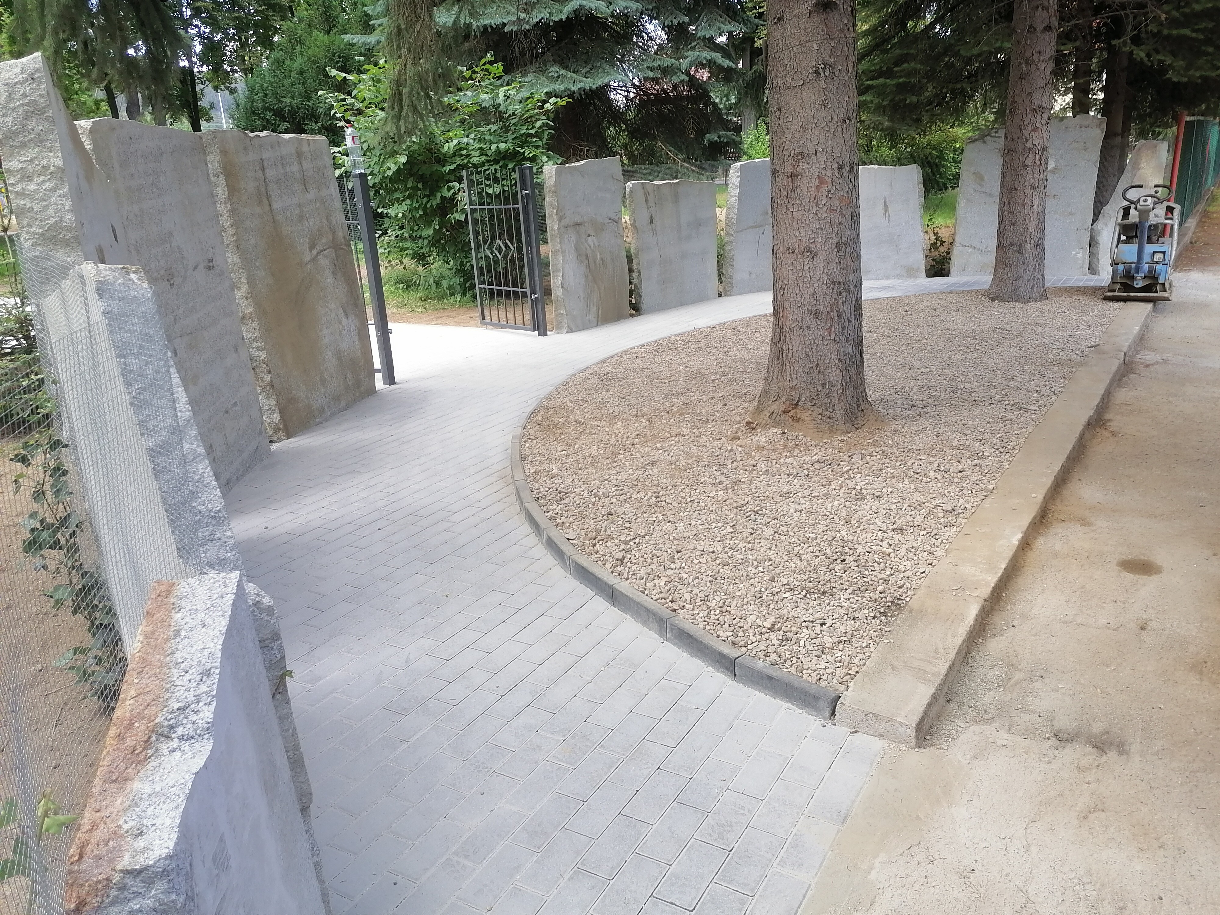 14. Budowa ogrodu przydomowego w Bogatyni. W ogrodzie utworzono oczko wodne wraz z roślinnością. Ponadto wykonano nawierzchnie naturalne z kostki granitowej i płyt kamiennych, nasadzenia roślin ozdobnych itp.