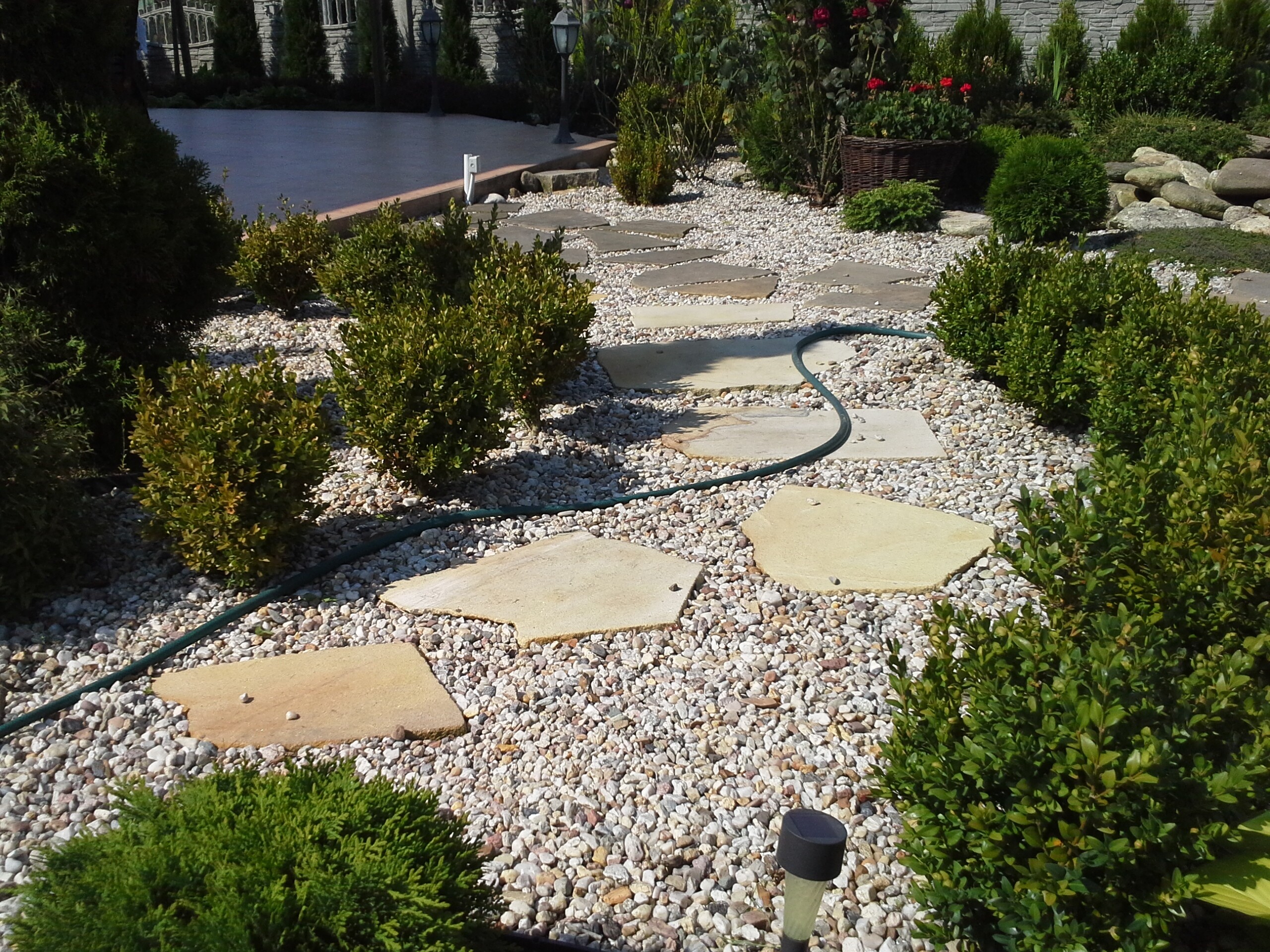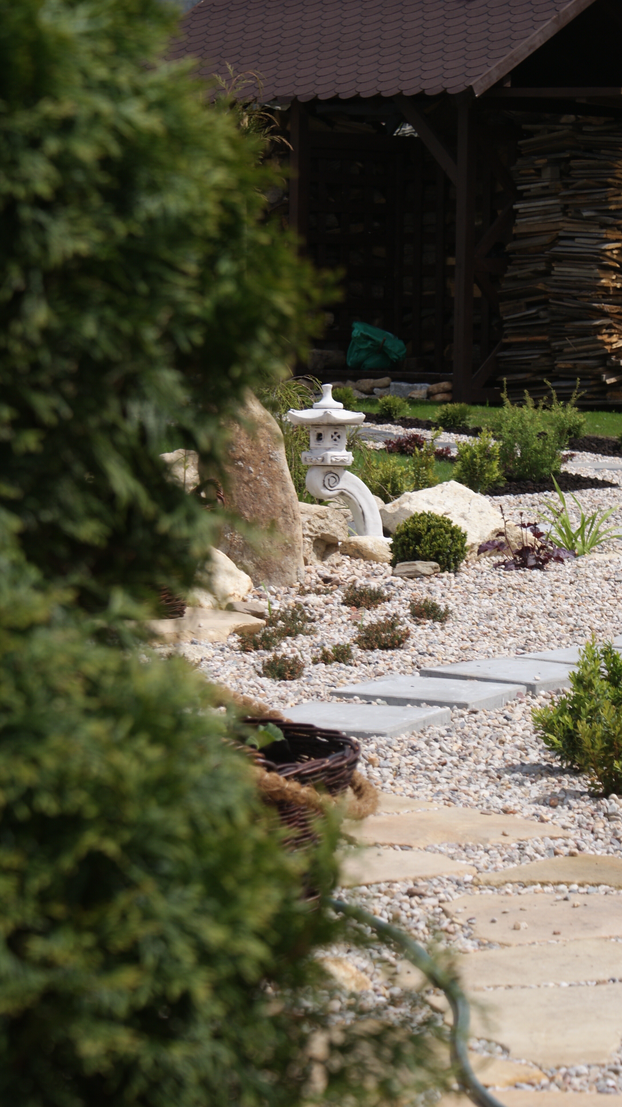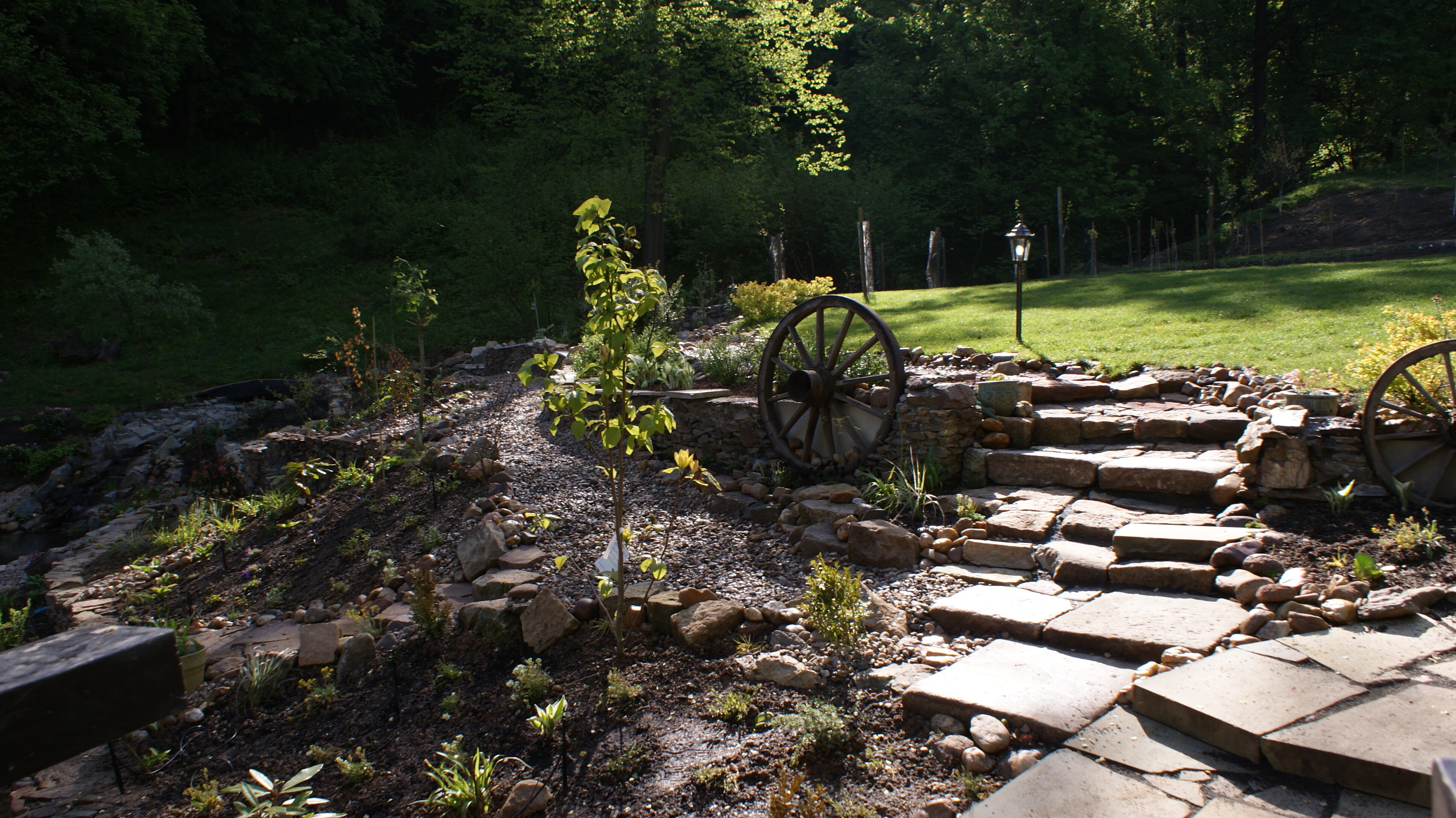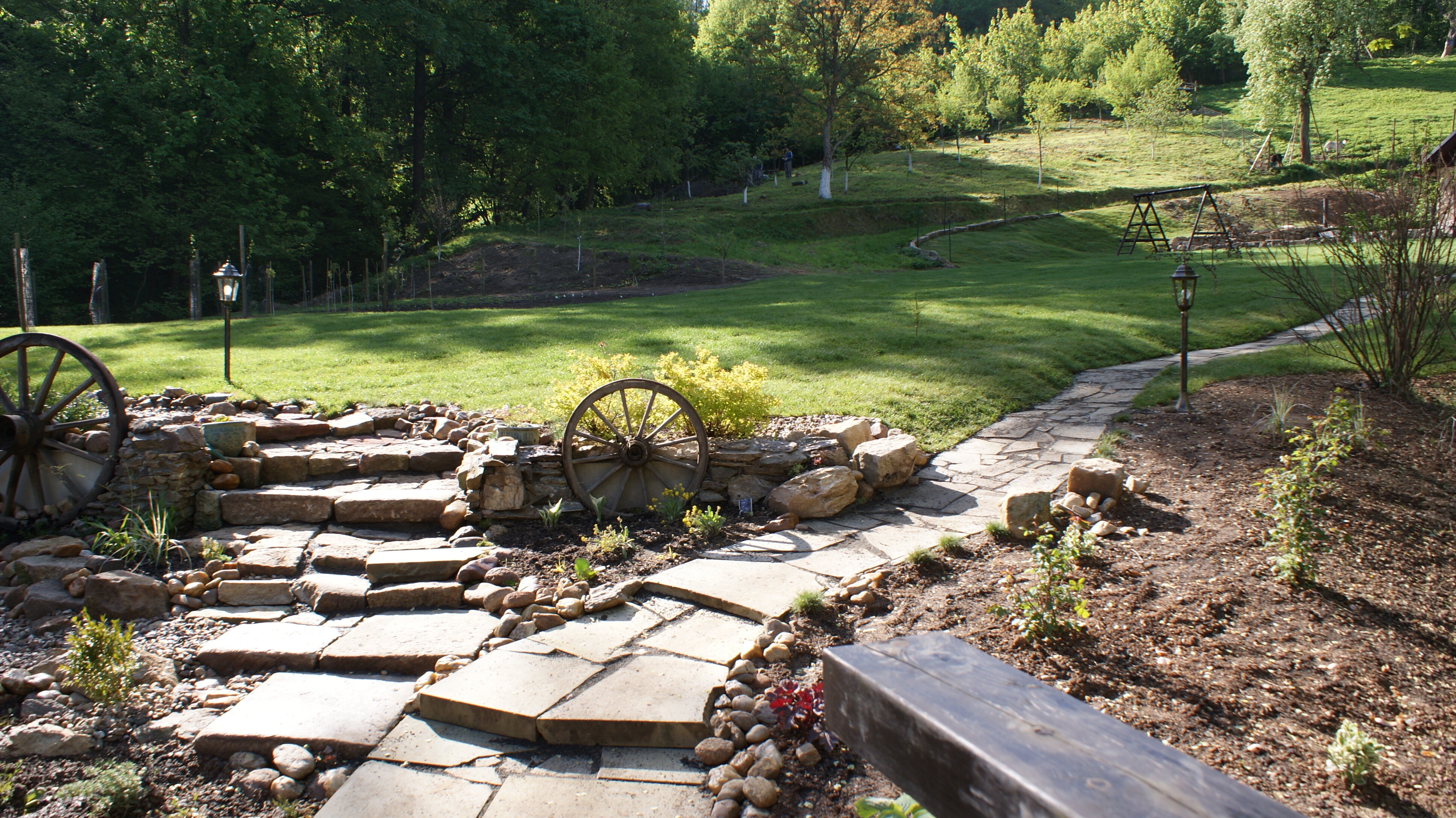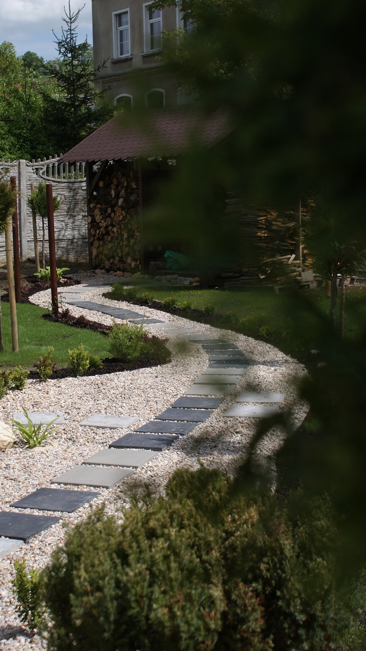 7. Budowa ogrodu przydomowego w stylu wiejskimW ogrodzie wykonano naturalnie ścieżki i place z kamienia, murki oporowe z łupka, dodatkowo wykonano nasadzenia roślinności ozdobnej oraz zabezpieczono skarpy trawnikiem w rolce.