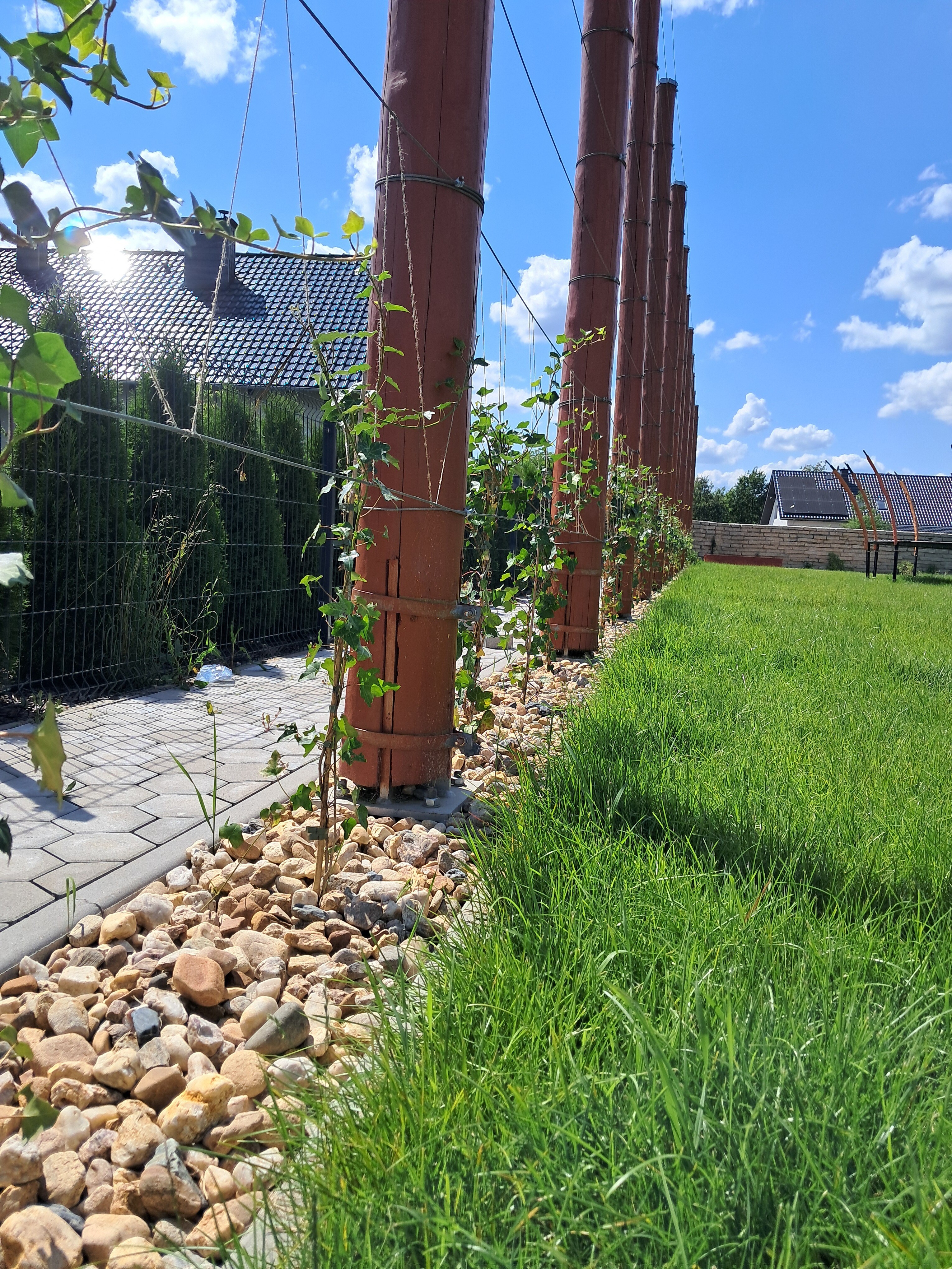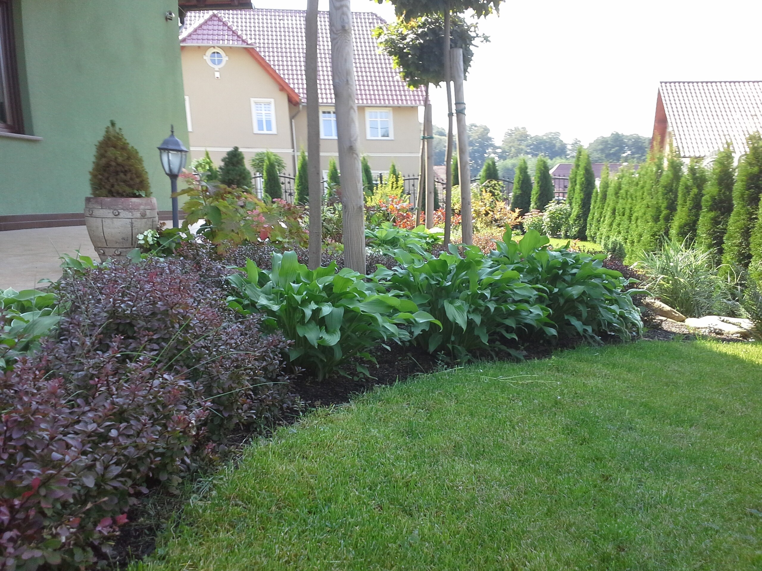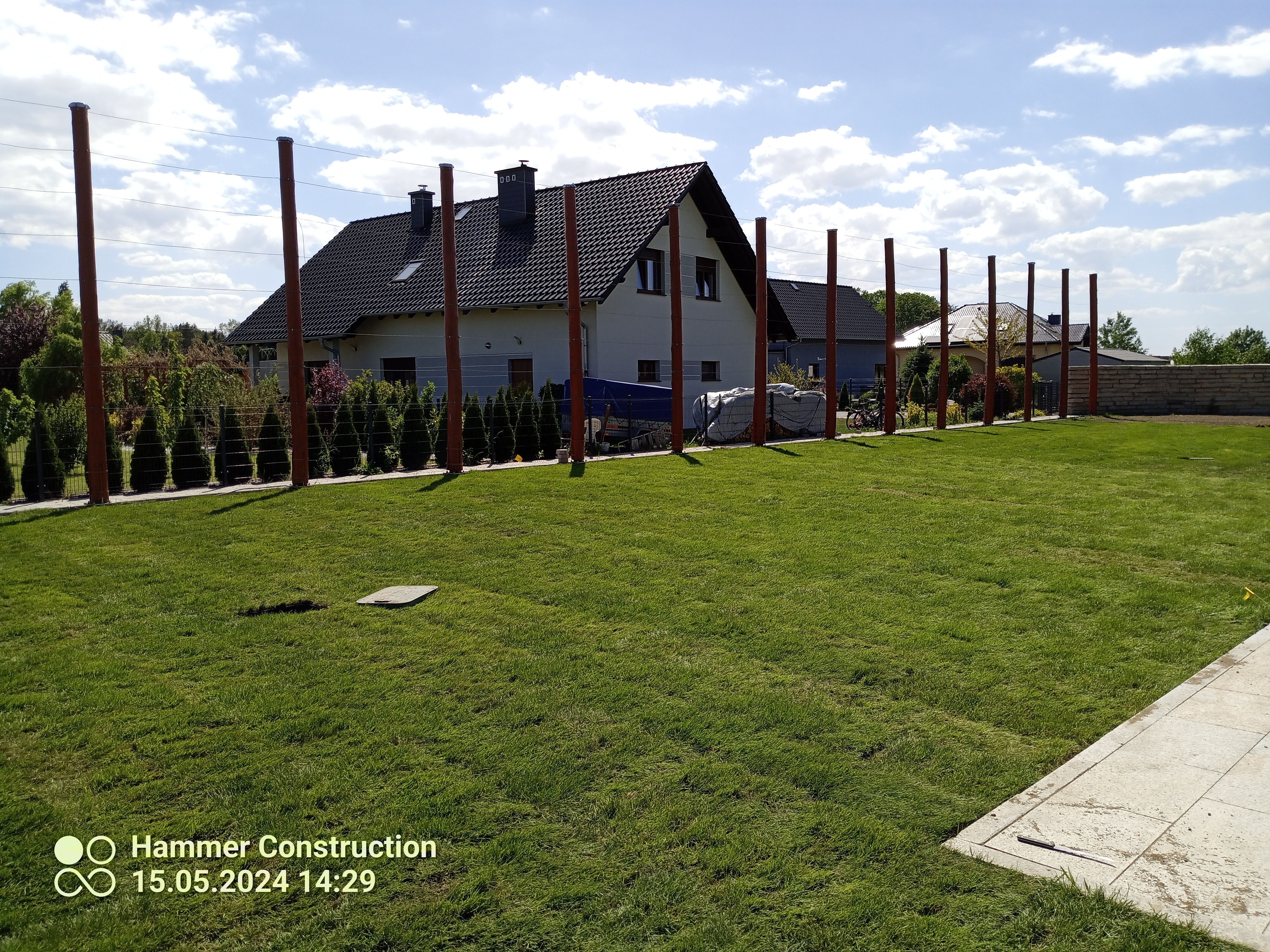 20. Ogród przydomowy w Pieńsku: W ramach założyliśmy 1600m2 trawnika z rolki wraz z system automatycznego nawadniania. Ponadto nasadzono drzewa i krzewy owocowe, system zielonej ściany poprzez nasadzenia roślin pnących na wcześniej przygotowaną konstrukcję z pali drewnianych.