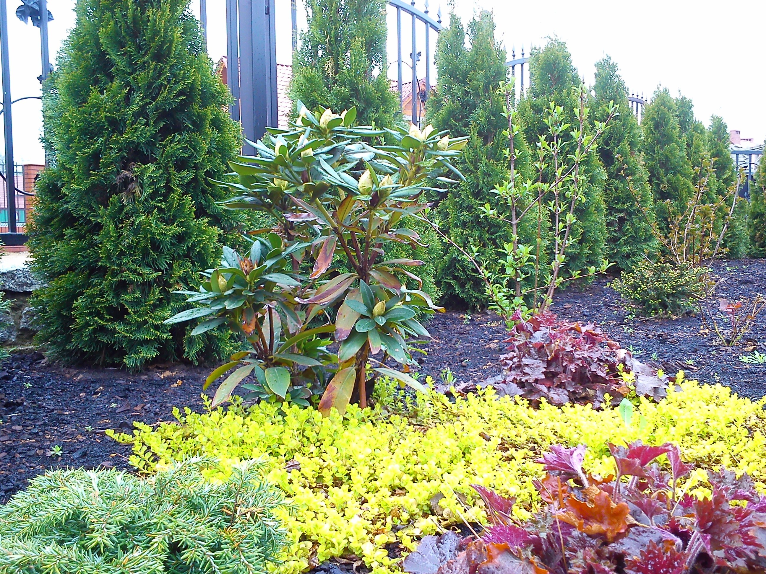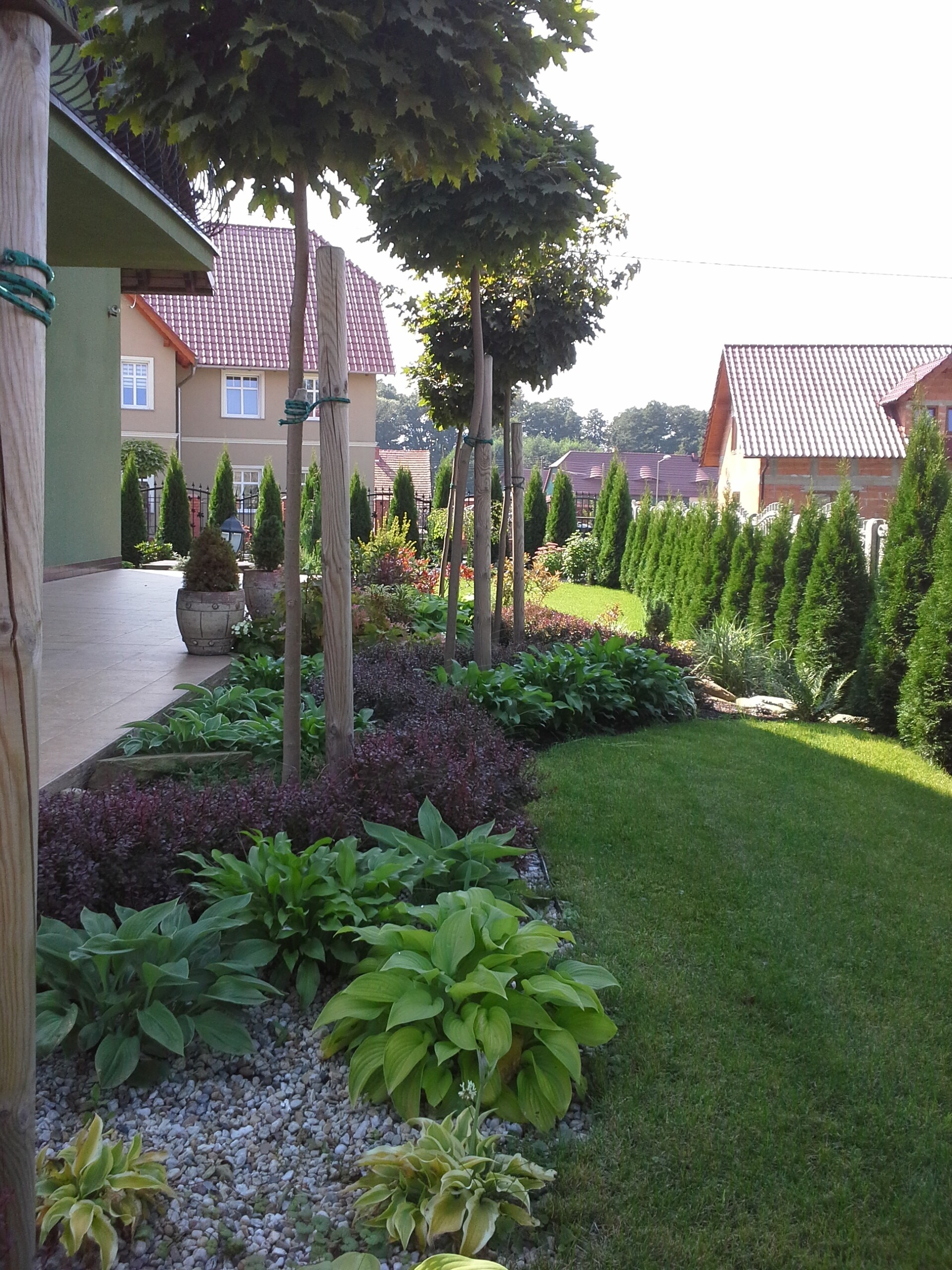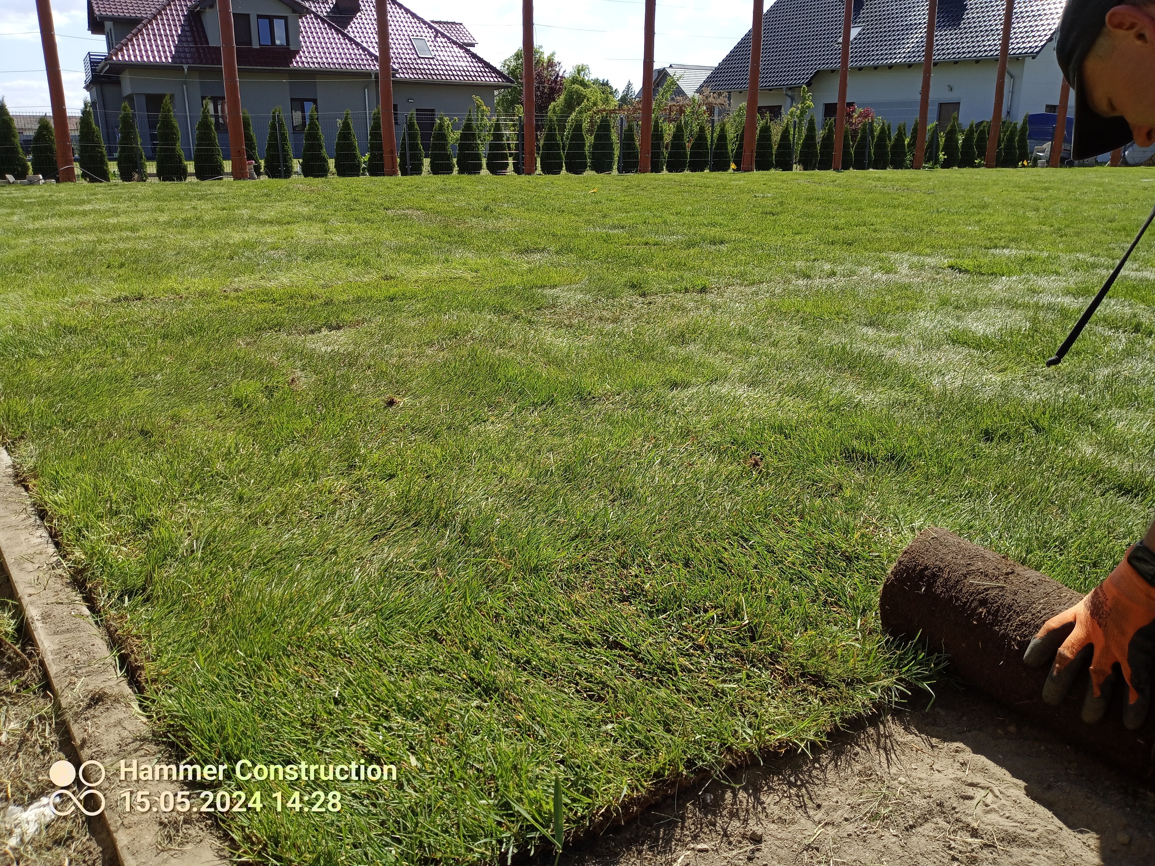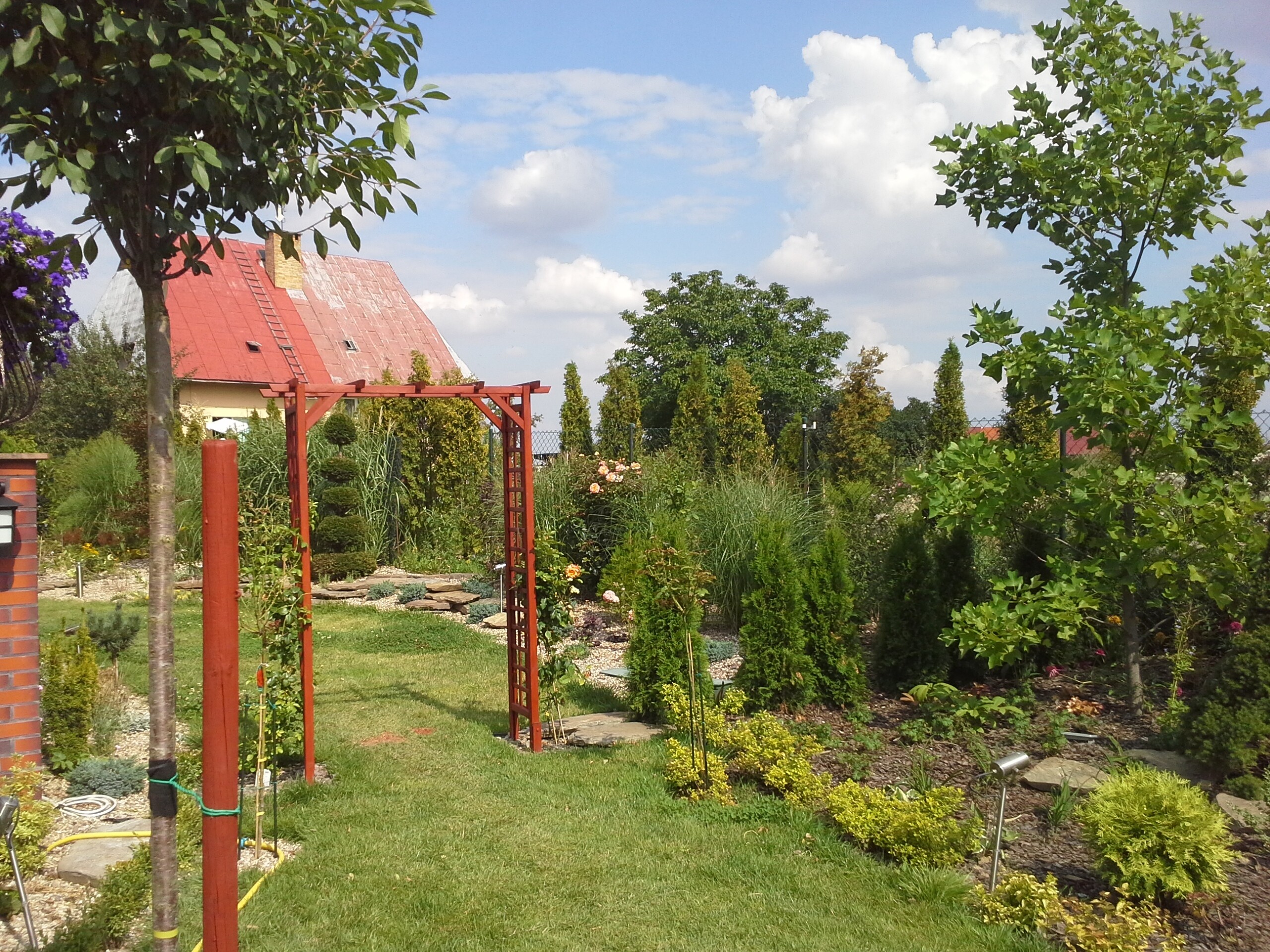 20. Ogród przydomowy w Pieńsku: W ramach założyliśmy 1600m2 trawnika z rolki wraz z system automatycznego nawadniania. Ponadto nasadzono drzewa i krzewy owocowe, system zielonej ściany poprzez nasadzenia roślin pnących na wcześniej przygotowaną konstrukcję z pali drewnianych.
