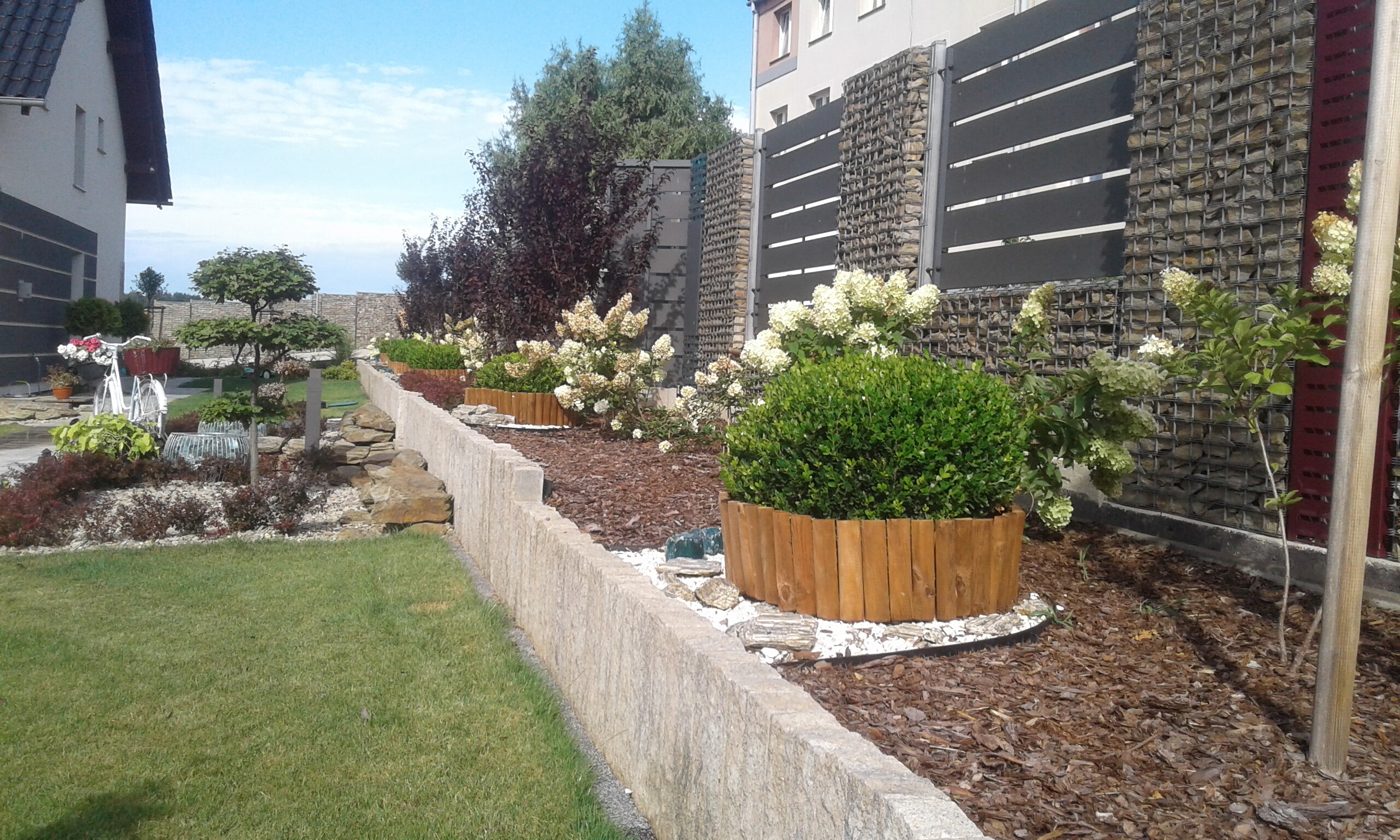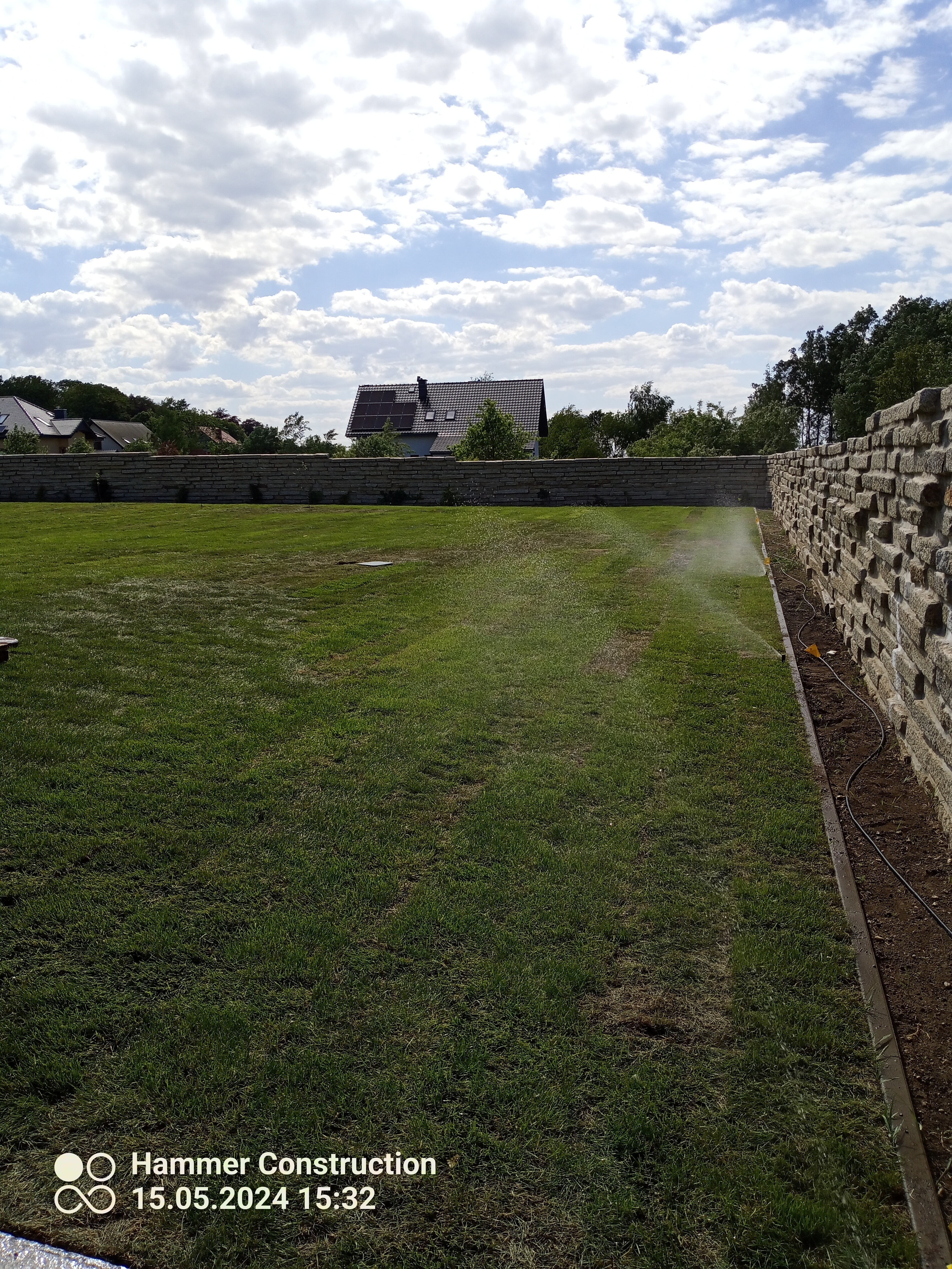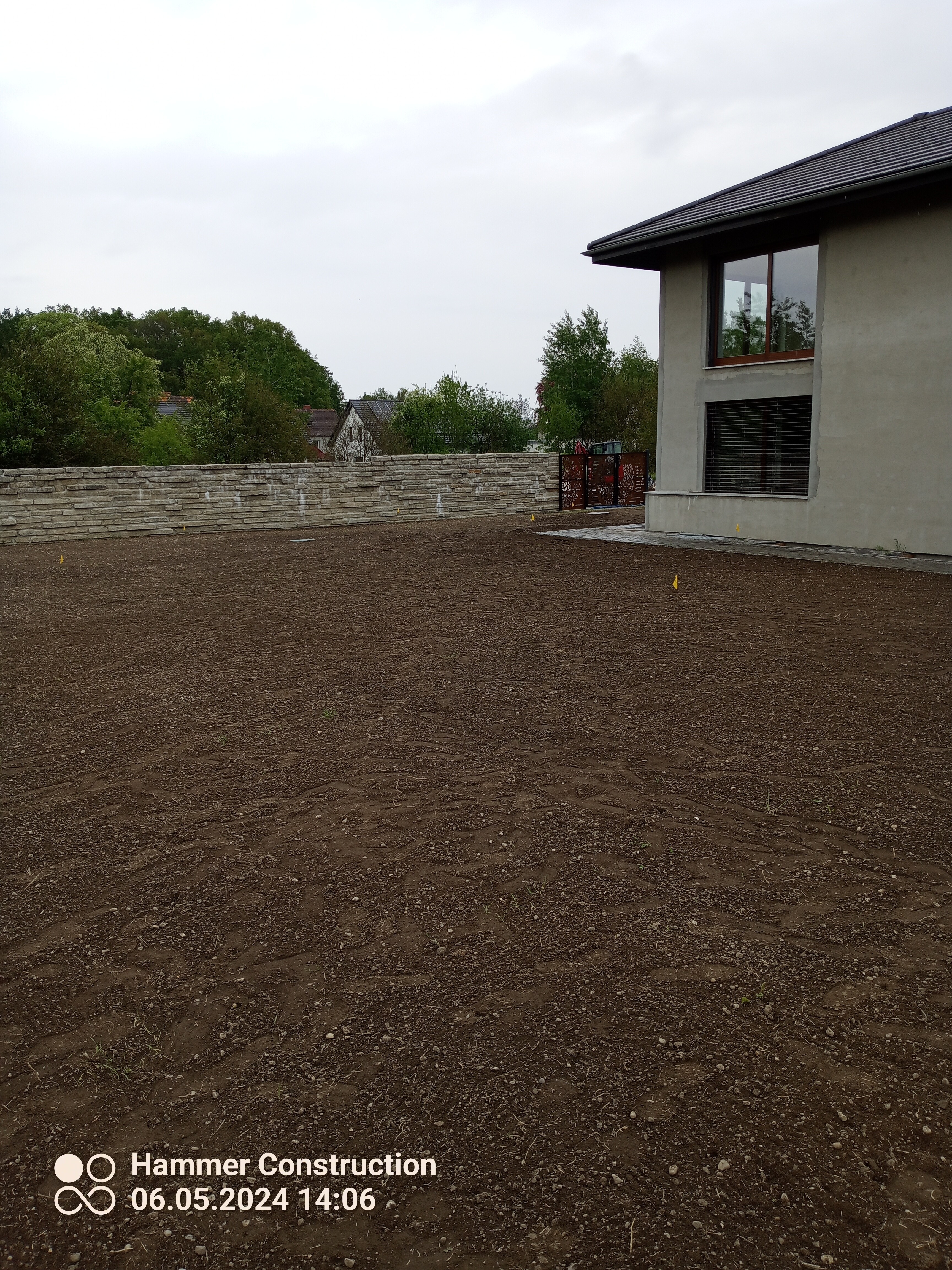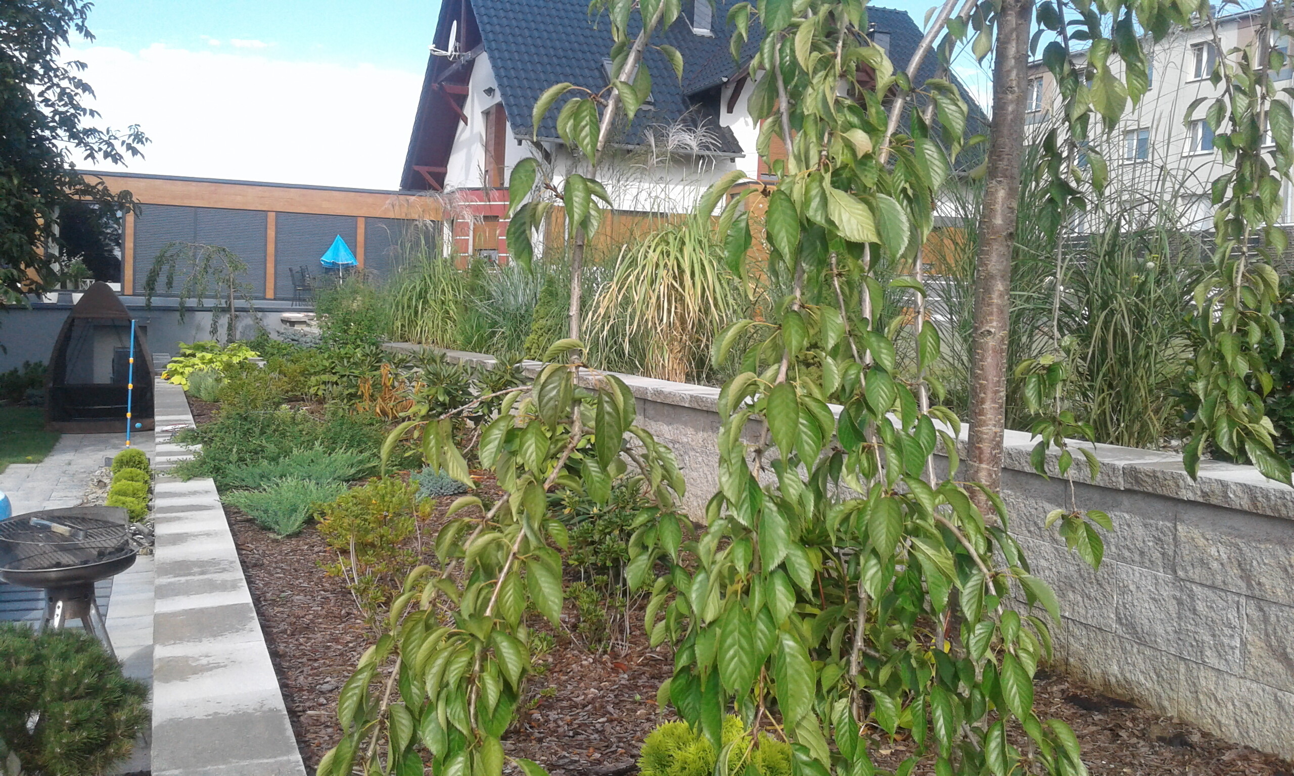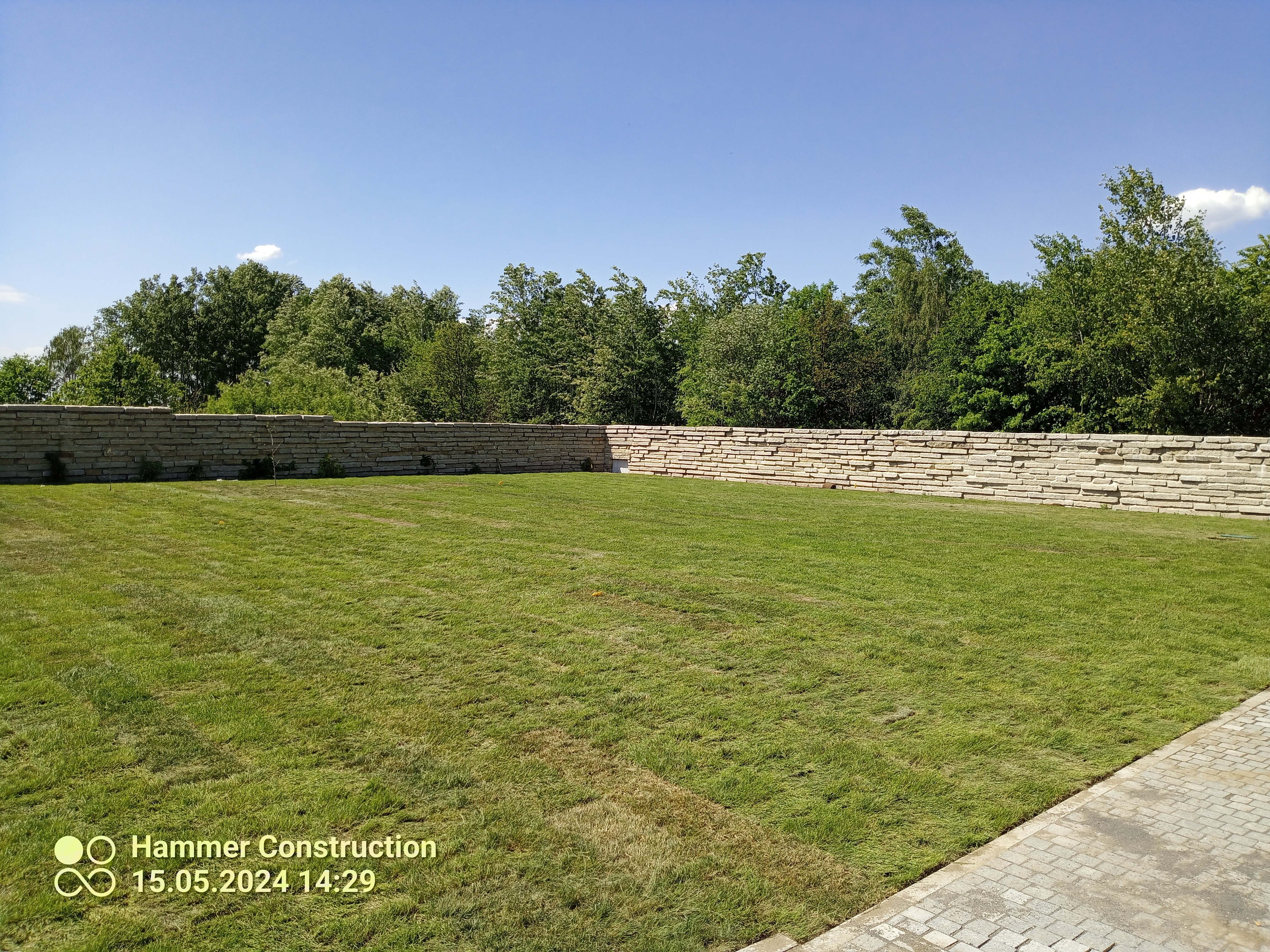 8. Realizacja ogrodu prywatnego. W ramach prac wykonano nowe nawierzchnie, system automatycznego nawodnienia, nasadzenia roślin ozdobnych. Ponadto na działce wykonano ogrom pracy związany z nasypem i profilowaniem mas ziemnych wraz z budową murów oporowych.