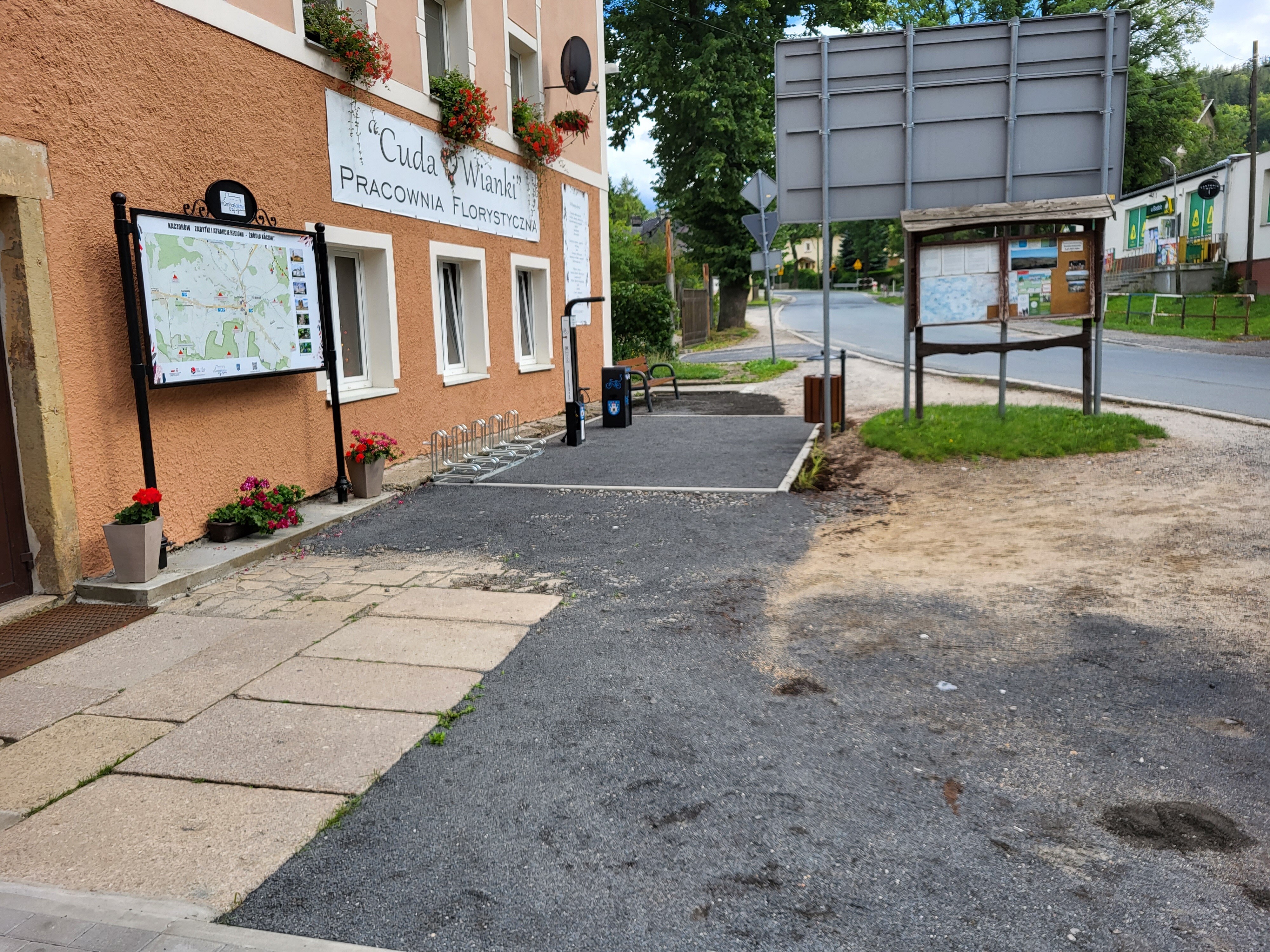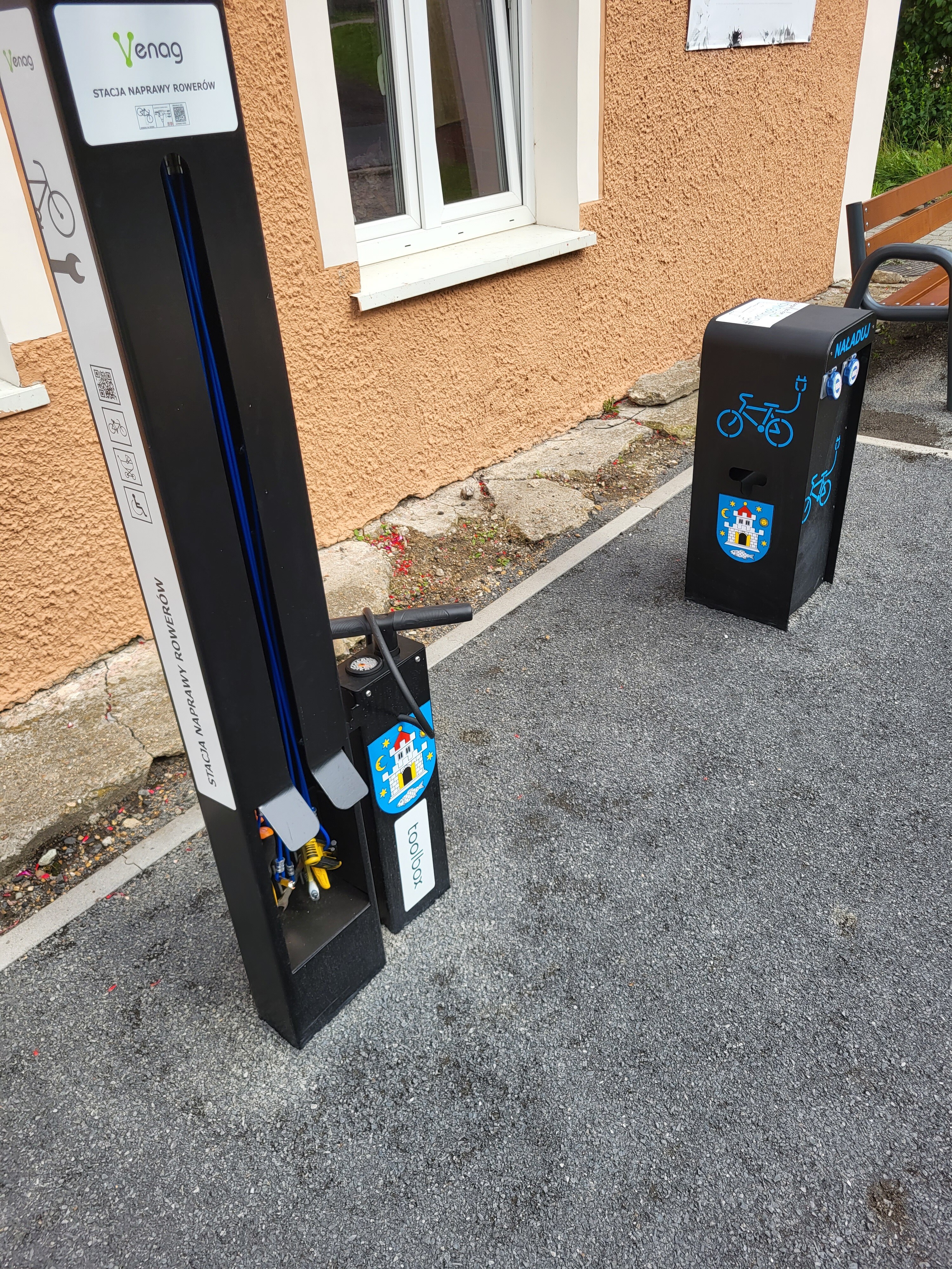 `15. Utworzenie strefy odpoczynku wraz ze stacją ładowania oraz stacją napraw dla rowerów i hulajnóg elektrycznych w miejscowości Kaczorów. Dodatkowo zamontowano tablicę przedstawiającą atrakcje turystyczne regionu. Inwestycja realizowana dla MiG Bolków.