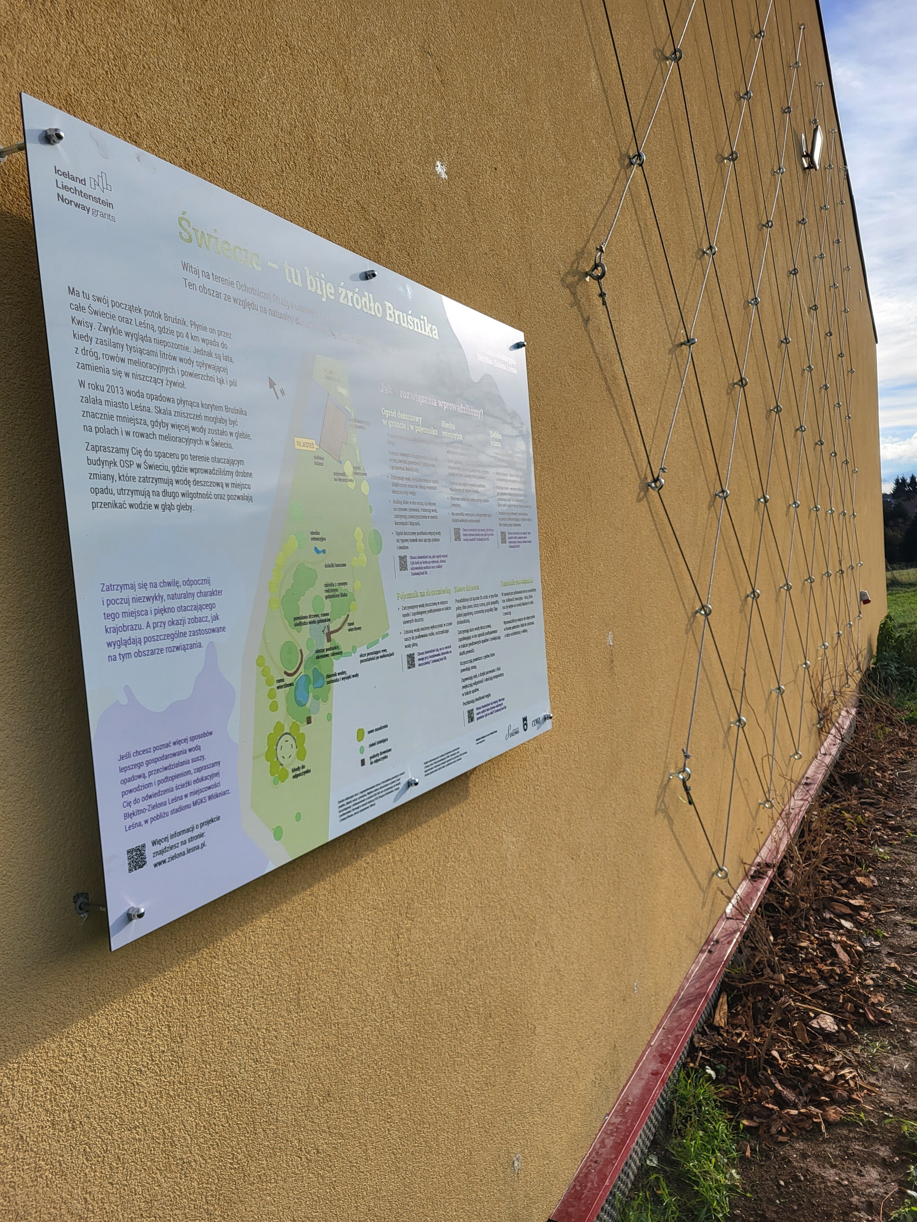 16. Realizacja projektu "Zielono-niebieska infrastruktura" dla gminy Leśna celem gromadzenia wód deszczowych. W ramach prac wykonano tzw. ogrody deszczowe wraz z nasadzeniami, zbiorniki na deszczówkę, ogrody deszczowe w pojemnikach, nasadzenia drzew. Ponadto wykonano punkty widokowe z deski tarasowej oraz miejsce na ognisko.