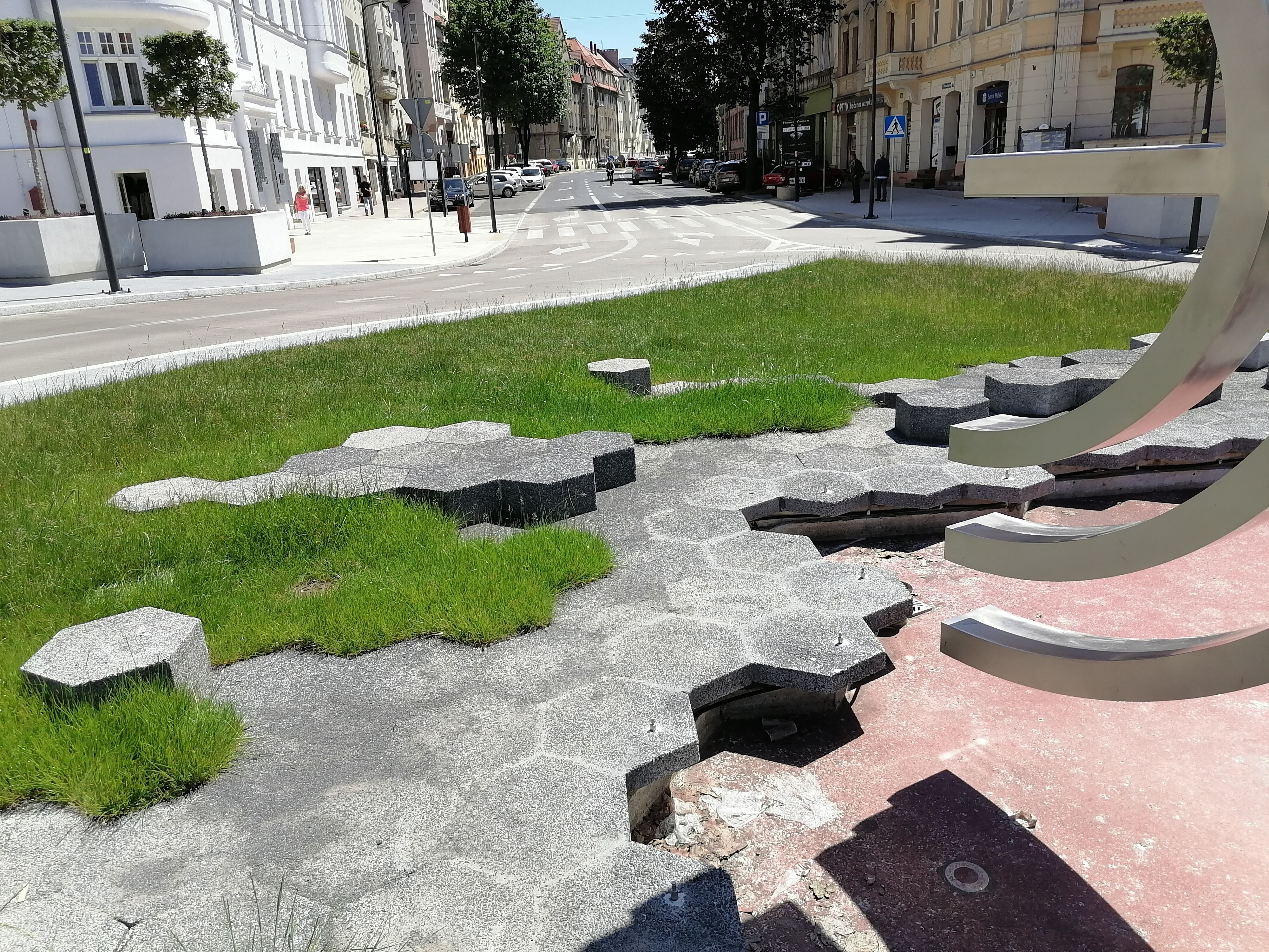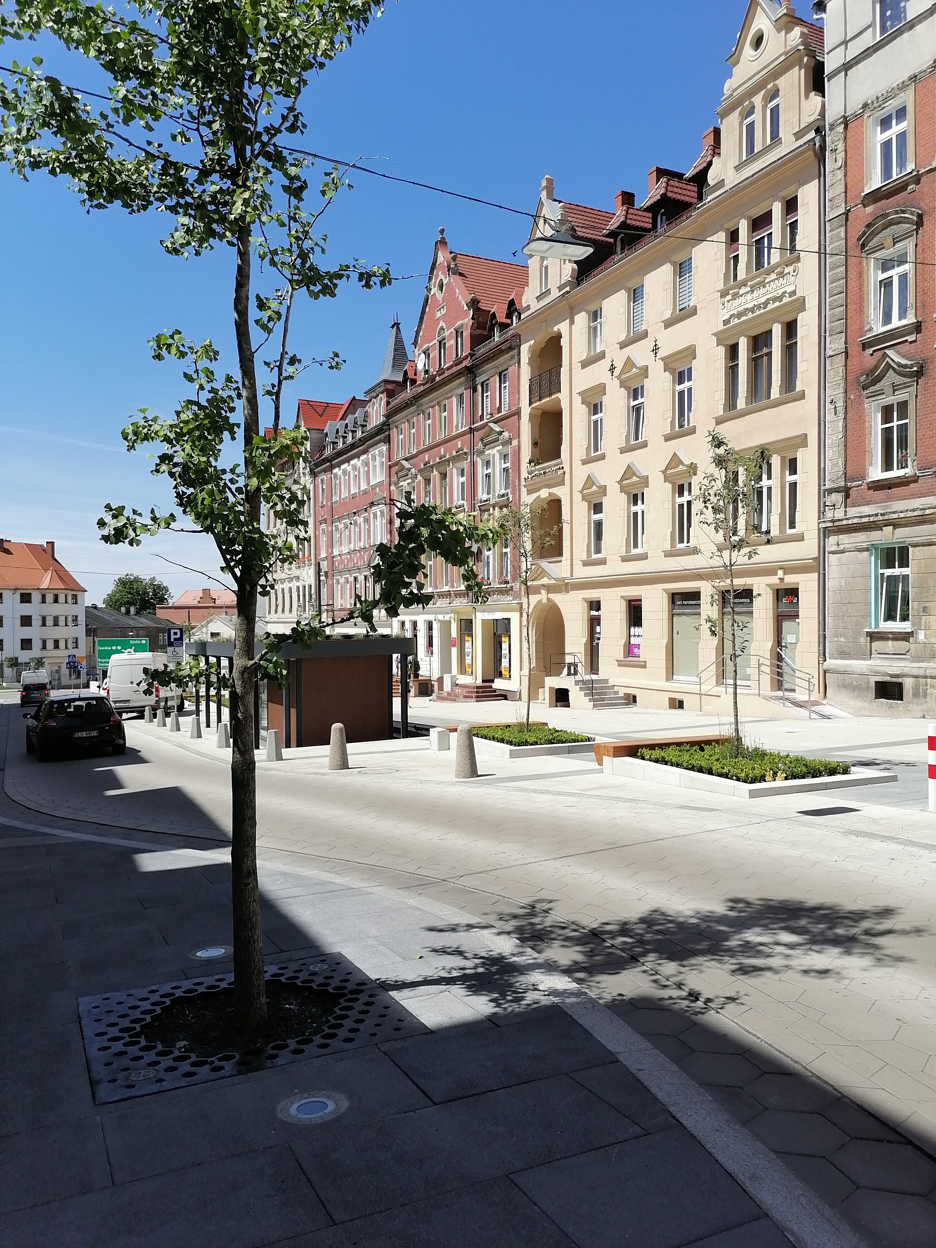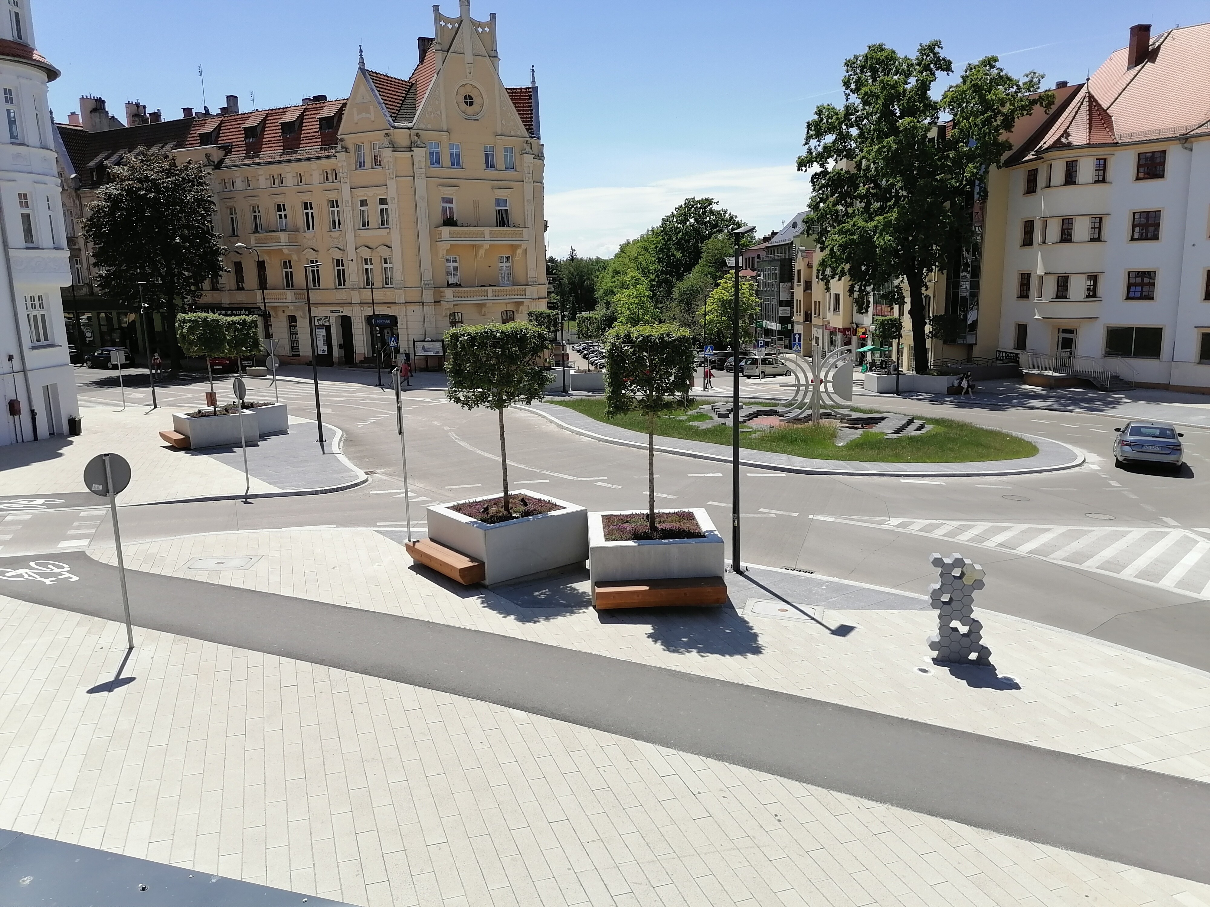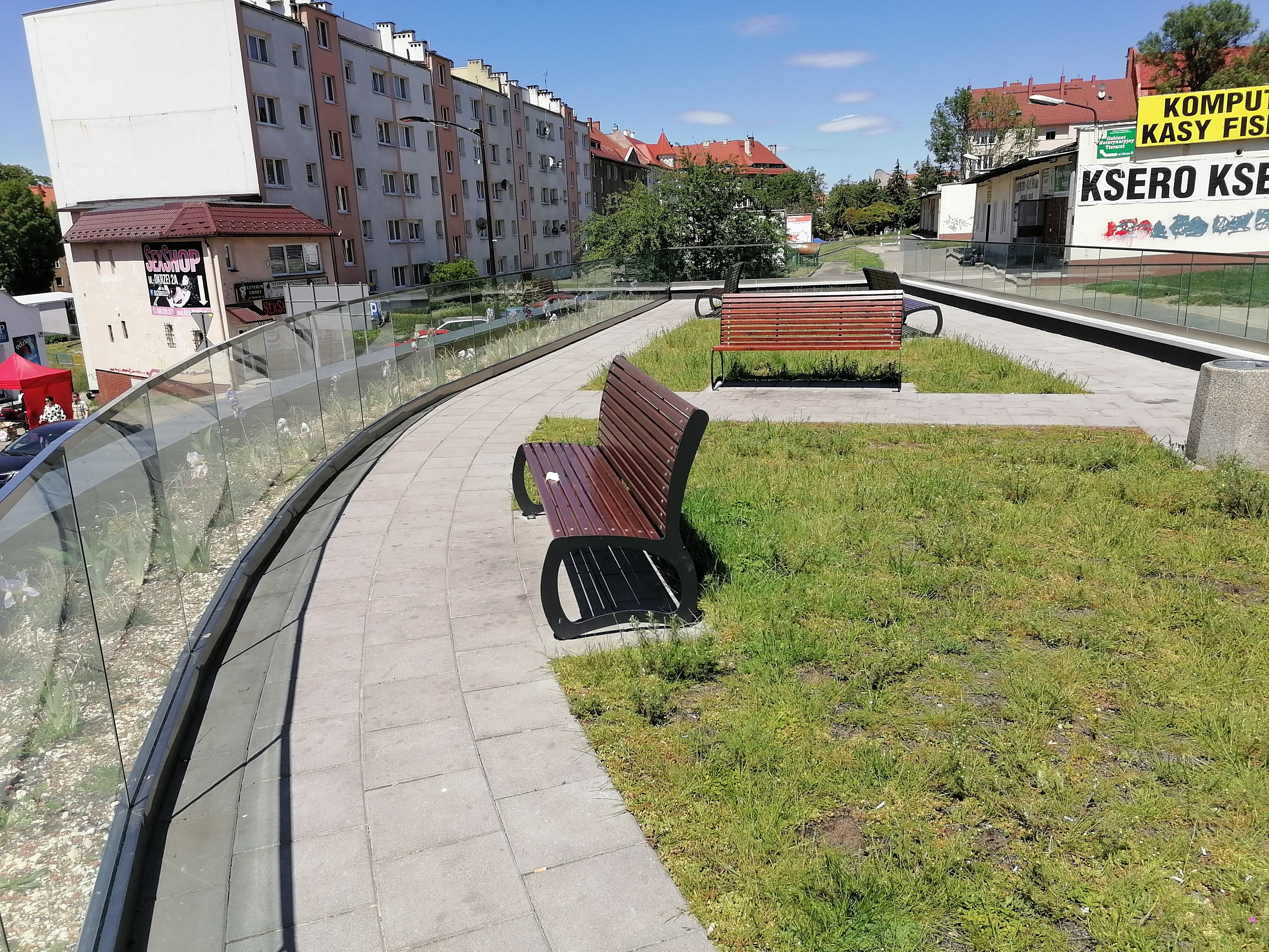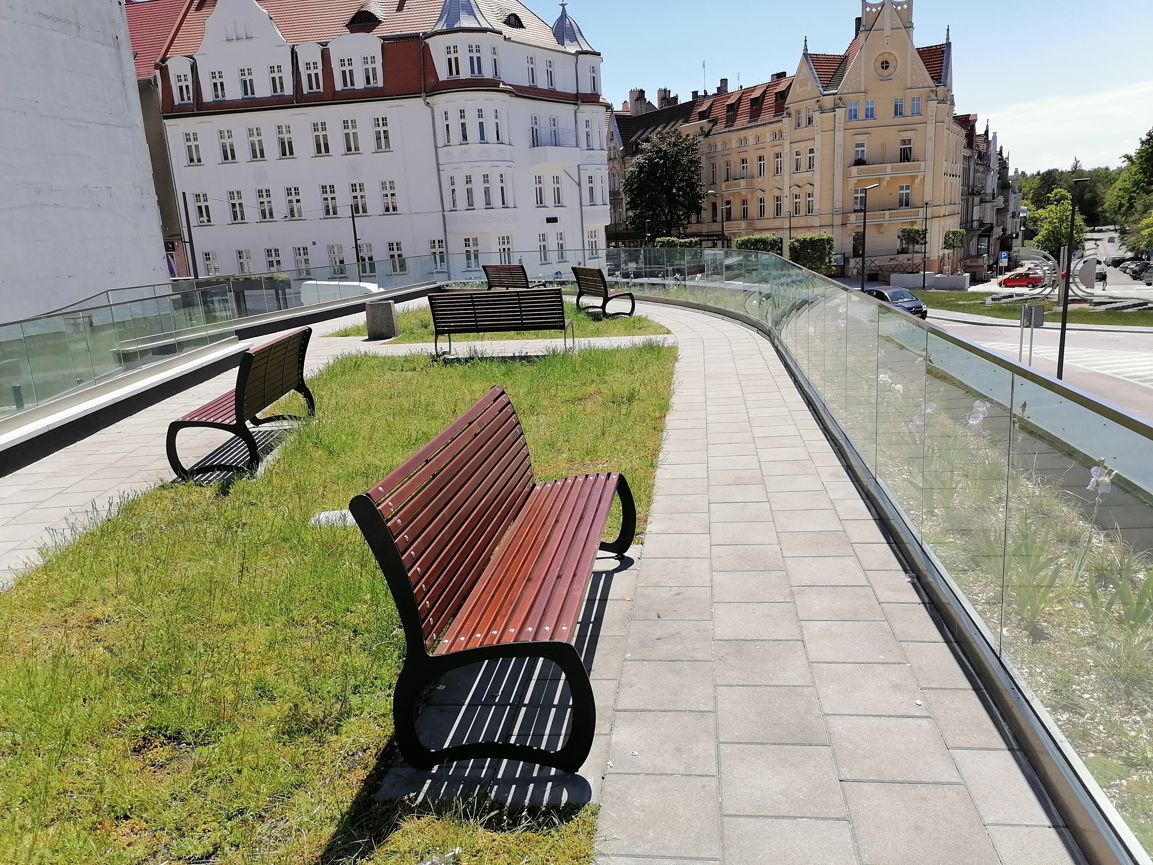 10. Rewitalizacja Śródmieścia w mieście Zgorzelec - w ramach projektu wykonano zielone dachy na budynku publicznym oraz pawilonach, nasadzono roślinność ozdobną w betonowych donicach, trawniki z rolki, systemy nawodnienia. Projekt realizowany techniką EFL - stabilizacja drzew, zielone dachy